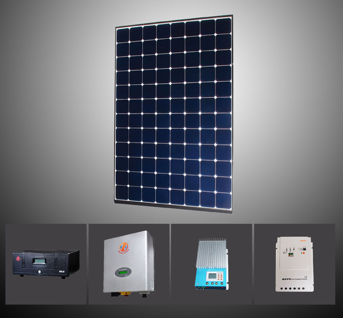 Integrated solar power system, combined with all the basic elements for a total solar solution: controller, inverter, AC bypass, solar and DC d terminal, with protecting breakers, friendly user interface and LCD display. No installation work and one button to start up.